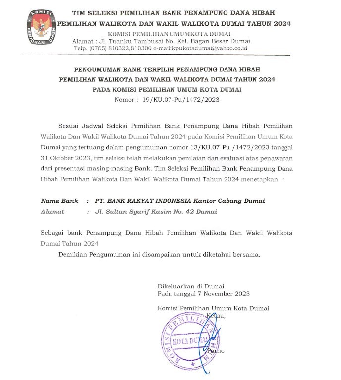 PENGUMUMAN BANK TERPILIH PENAMPUNG DANA HIBAH PEMILIHAN WALIKOTA DAN WAKIL WALIKOTA DUMAI TAHUN 2024 Selasa, 07 November 2023 15:00 1290 Info Selengkapnya Klik Disini Bagikan: Telah dilihat 1,290 kali