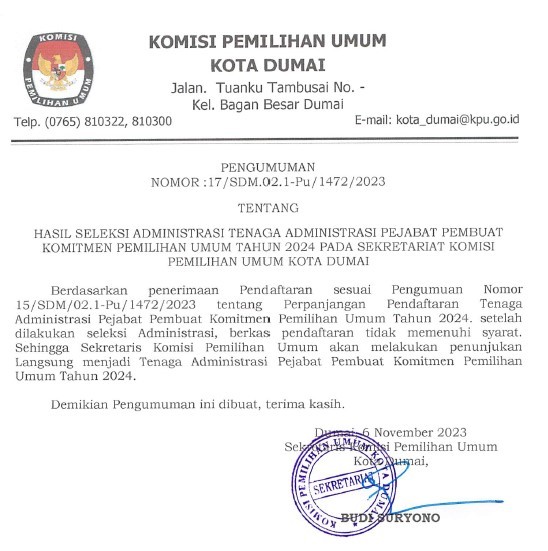PENGUMUMAN HASIL SELEKSI ADMINISTRASI TENAGA ADMINISTRASI PPK PEMILU 2024 - KPU KOTA DUMAI Senin, 06 November 2023 15:00 1279 Info Selengkapnya Klik Disini Bagikan: Telah dilihat 1,279 kali