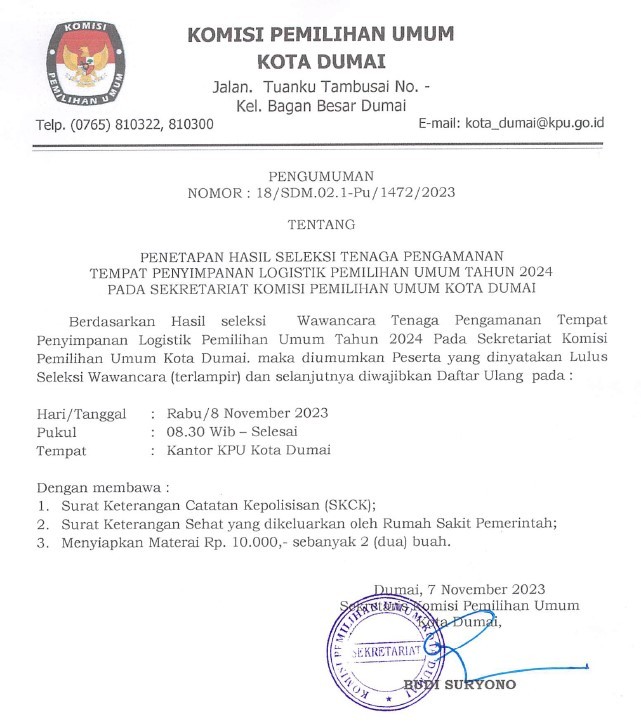 PENGUMUMAN PENETAPAN HASIL SELEKSI TENAGA PENGAMANAN PENYIMPANAN LOGISTIK KPU KOTA DUMAI TAHUN 2024 Selasa, 07 November 2023 11:00 985 Info Selengkapnya Klik Disini Bagikan: Telah dilihat 985 kali