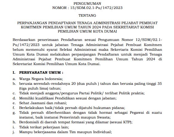 PENGUMUMAN TENTANG PERPANJANGAN PENDAFTARAN TENAGA ADMINISTRASI PEJABAT PEMBUAT KOMITMEN PEMILIHAN UMUM TAHUN 2024 PADA SEKRETARIAT KOMISI PEMILIHAN UMUM KOTA DUMAI Minggu, 05 November 2023 13:00 992 Info Selengkapnya Klik Disini Surat Lamaran Surat Pernyataan Bagikan: Telah dilihat 992 kali