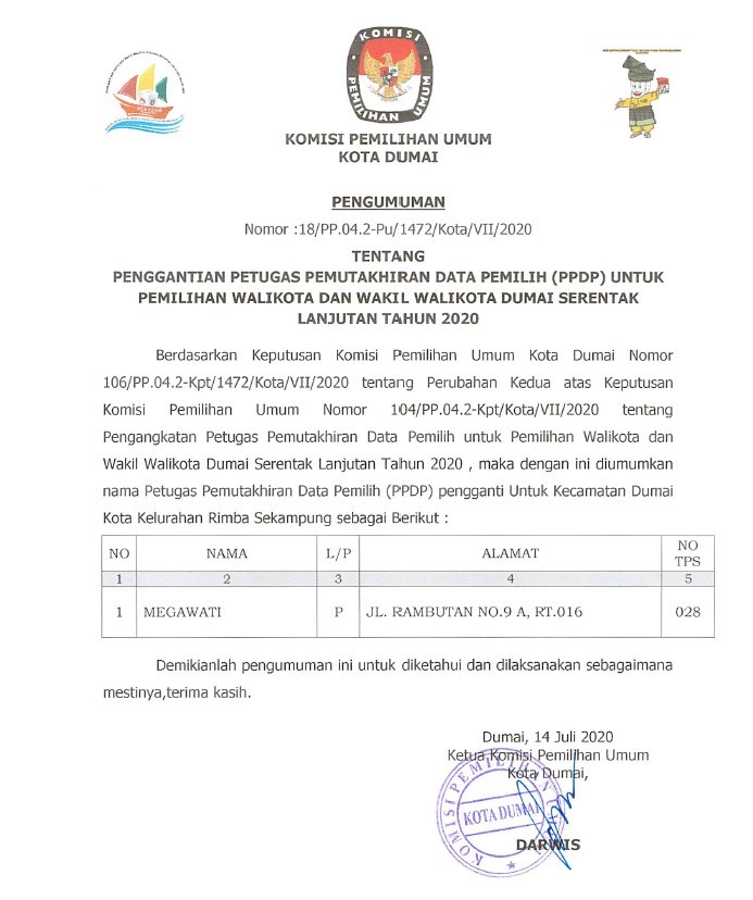 TENTANG PENGGANTIAN PETUGAS PEMUTAKHIRAN DATA PEMILIH (PPDP) UNTUK PEMILIHAN WALIKOTA DAN WAKIL WALIKOTA DUMAI SERENTAK LANJUTAN TAHUN 2020