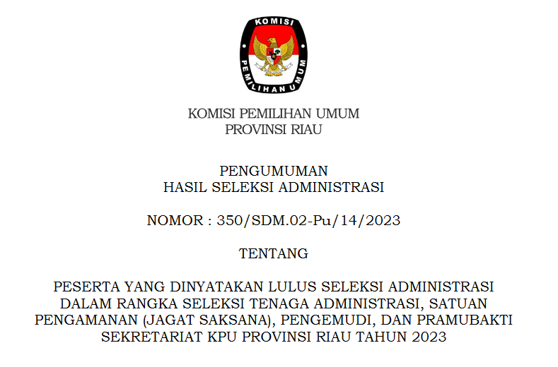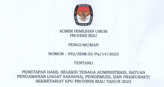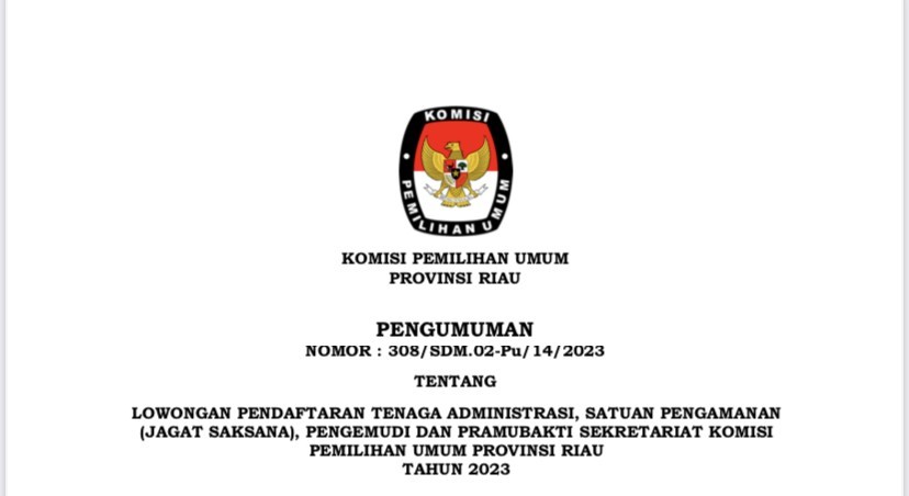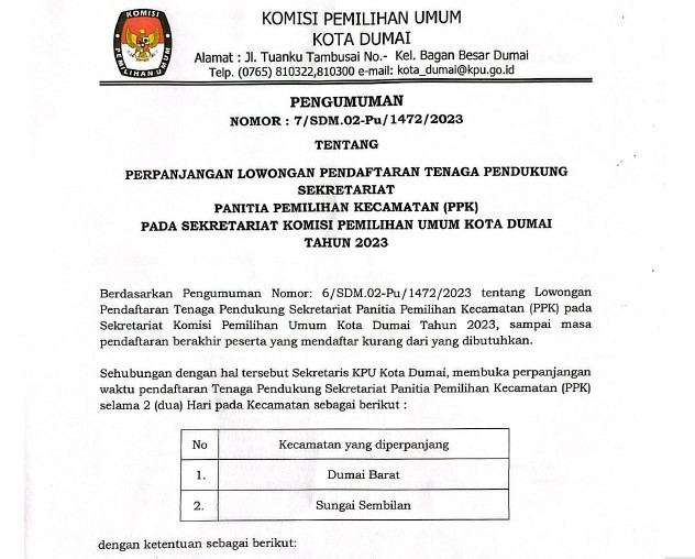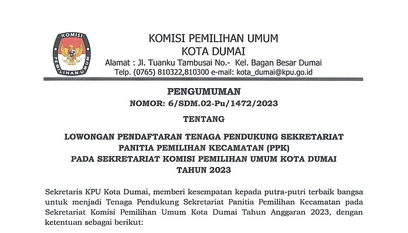 Sehubungan dengan tahapan pembentukan Petugas Pemutakhiran Data Pemilih untuk Pemilu Tahun 2024, bersama ini Komisi Pemilihan Umum Kabupaten Kota Dumai mengumumkan hal berikut :
