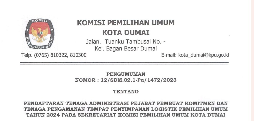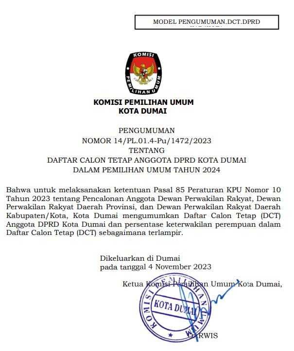 Berdasarkan Berita Acara Pleno KPU Kota Dumai Nomor. 402/PL.01.4-BA/1472/2023 tanggal 3 November 2023 KPU Kota Dumai telah menetapkan Daftar Calon Tetap (DCT) Anggota DPRD Kota Dumai Pemilu Tahun 2024 dengan Surat Keputusan KPU Kota Dumai Nomor 155 Tahun 2023. Jumlah Calon DPRD Kota Dumai Pemilu 2024 di tetapkan sebanyak 518 Calon yang terdiri dari 340 Calon Laki-laki dan 178 Calon Perempuan.