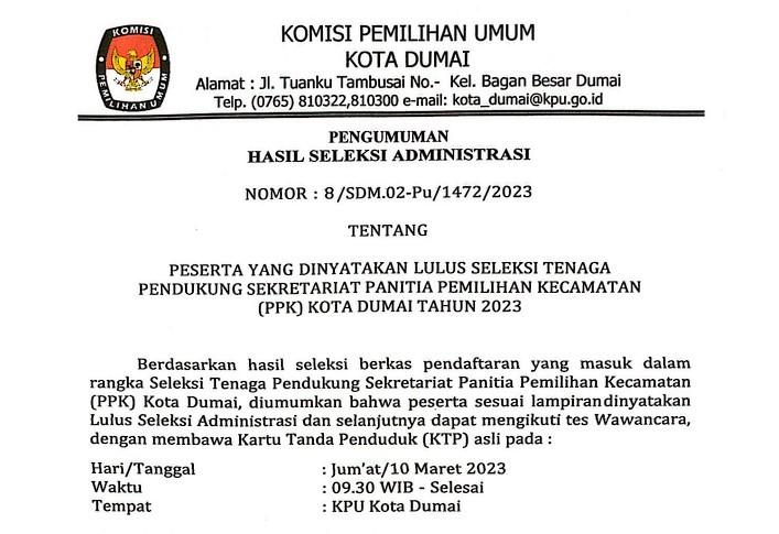 Komisi Pemilihan Umum Kota Dumai membuka penerimaan pengajuan bakal calon anggota Dewan Perwakilan Rakyat Daerah (DPRD) Kota Dumai untuk Pemilu Serentak Tahun 2024 melalui Partai Politik Peserta Pemilu pada kepengurusan tingkat Kota dengan ketentuan sebagai berikut: 1. Waktu Pengajuan : a. Hari/Tanggal : Senin, 1 Mei s.d Sabtu 13 Mei 2023 Pukul : 08.00 s.d 16.00 WIB b. Hari/Tanggal : Minggu, 14 Mei 2023 Pukul : 08.00 s.d 23.59 WIB 2. Tempat Pengajuan Kantor KPU Kota Dumai, Jalan Tuanku Tambusai No. Kel Bagan Besar Kec. Bukit Kapur A. DOKUMEN PENGAJUAN 1. Surat Pengajuan menggunakan formulir MODEL B-PENGAJUAN-PARPOL dalam bentuk fisik disampaikan langsung dan digital yang diunggah di Silon; 2. Daftar Bakal Calon menggunakan formulir MODEL B-DAFTAR.BAKAL.CALON disertai foto diri terbaru bakal calon dan dilampiri dengan dokumen persetujuan pengajuan bakal calon yang ditandatangani oleh Ketua Umum Partai Politik Peserta Pemilu atau nama lain dan Sekretaris Jenderal Partai Politik Peserta Pemilu atau nama lain yang sah sesuai dengan Keputusan Menteri yang menyelenggarakan urusan pemerintahan di bidang hukum dan hak asasi manusia tentang pengesahan susunan pengurus partai politik tingkat pusat dalam bentuk fisik disampaikan langsung dan digital yang diunggah di Silon; dan 3. Dokumen persyaratan administrasi Bakal Calon sebagaimana dimaksud dalam Pasal 12 sampai dengan Pasal 23 PKPU No.10 Tahun 2023 tentang Pencalonan Anggota DPR, DPRD Provinsi dan DPRD Kabupaten/Kota dalam bentuk digital diunggah di Silon. B. LAIN-Lain 1. Ketentuan Pengajuan Bakal Calon Anggota DPRD Kota a} Partai Politik Peserta Pemilu pada kepengurusan tingkat Kota Dumai dapat mengajukan bakal calon Anggota DPRD Kota Dumai apabila telah: 1. memperoleh persetujuan dari Ketua Umum Partai Politik Peserta Pemilu atau nama lain dan Sekretaris Jenderal Partai Politik Peserta Pemilu atau nama lain yang sah. 2. mengirimkan data dan dokumen persyaratan yang diunggah melalui Silon. b} Pengajuan sebagaimana dimaksud huruf a dilakukan oleh: 1.Ketua Partai Politik Peserta Pemilu pada kepengurusan tingkat Kota atau nama lain dan sekretaris Partai Politik Peserta Pemilu pada kepengurusan tingkat Kota atau nama lain yang sah, 2.dalam hal Ketua Partai Politik Peserta Pemilu pada kepengurusan tingkat Kota atau nama lain dan Sekretaris Partai Politik Peserta Pemilu pada kepengurusan tingkat Kota atau nama lain yang sah sebagaimana dimaksud pada huruf 1) tidak dapat hadir pada saat pengajuan bakal calon, pengajuan dapat diwakili oleh pengurus Partai Politik Peserta Pemilu pada kepengurusan tingkat Kota dengan menyampaikan surat kuasa dari ketua Partai Politik Peserta Pemilu pada kepengurusan tingkat Kota atau nama lain dan sekretaris Partai Politik Peserta Pemilu pada kepengurusan tingkat Kota atau nama lain yang sah 3.dalam hal Pengurus Partai Politik Peserta Pemilu pada kepengurusan tingkat Kota tidak dapat melakukan pengajuan bakal calon Anggota DPRD Kota sebagaimana dimaksud pada angka 2), pengajuan persyaratan bakal calon dapat dilakukan oleh Petugas Penghubung Partai Politik Peserta Pemilu pada kepengurusan tingkat Kota. 2,. Dalam hal pemeriksaan kelengkapan dokumen pengajuan bakal calon ditemukan: a} isian data dan dokumen persyaratan pengajuan bakal calon tidak lengkap; b} daftar Bakal Calon sebagaimana dimaksud pada huruf A angka 2 tidak memenuhi persyaratan pengajuan Bakal Calon sebagaimana dimaksud dalam Pasal 8 ayat (1) PKPU No.10 Tahun 2023 tentang Pencalonan Anggota DPR, DPRD Provinsi dan DPRD Kabupaten/Kota.; dan/atau c} dokumen fisik surat pengajuan dan/atau daftar Bakal Calon sebagaimana dimaksud pada huruf A angka 1 dan angka 2 tidak benar. KPU Kota Dumai mengembalikan dokumen pengajuan bakal calon kepada Partai Politik Peserta Pemilu pada kepengurusan tingkat kota. 3. Partai Politik Peserta Pemilu yang Pengajuan bakal calon anggota DPRD Kota Dumai nya dikembalikan sebagaimana dimaksud angka 2 masih dapat mengajukan bakal calon sampai dengan batas akhir waktu pengajuan pada Hari Terakhir. 4. Dokumen surat pengajuan dan daftar bakal calon sebagaimana dimaksud huruf A angka 1 dan angka 2, dapat diunduh pada laman https://silon.kpu.go.id 5. Pelayanan dan penjelasan informasi terkait pengajuan bakal calon anggota DPRD Kota dapat menghubungi helpdesk KPU Kota a. Telepon : 0765-810322 pada hari kerja dari pukul 08.00 s.d 17.00 WIB b. No Hp : - 0852 6567 8542 ( Edi Indra – Ketua Divisi Teknis) - 0813 6304 7882 (Fivian Auliya – Kasubbag Teknis) c. Email : ppidkpukotadumai@gmail.com Pengumuman Unduh disini